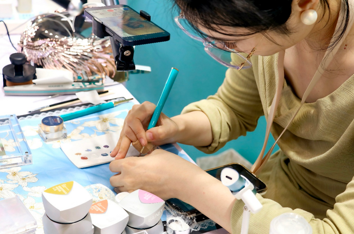 ▲职工录制甲油胶彩绘演示视频。Zoe|摄