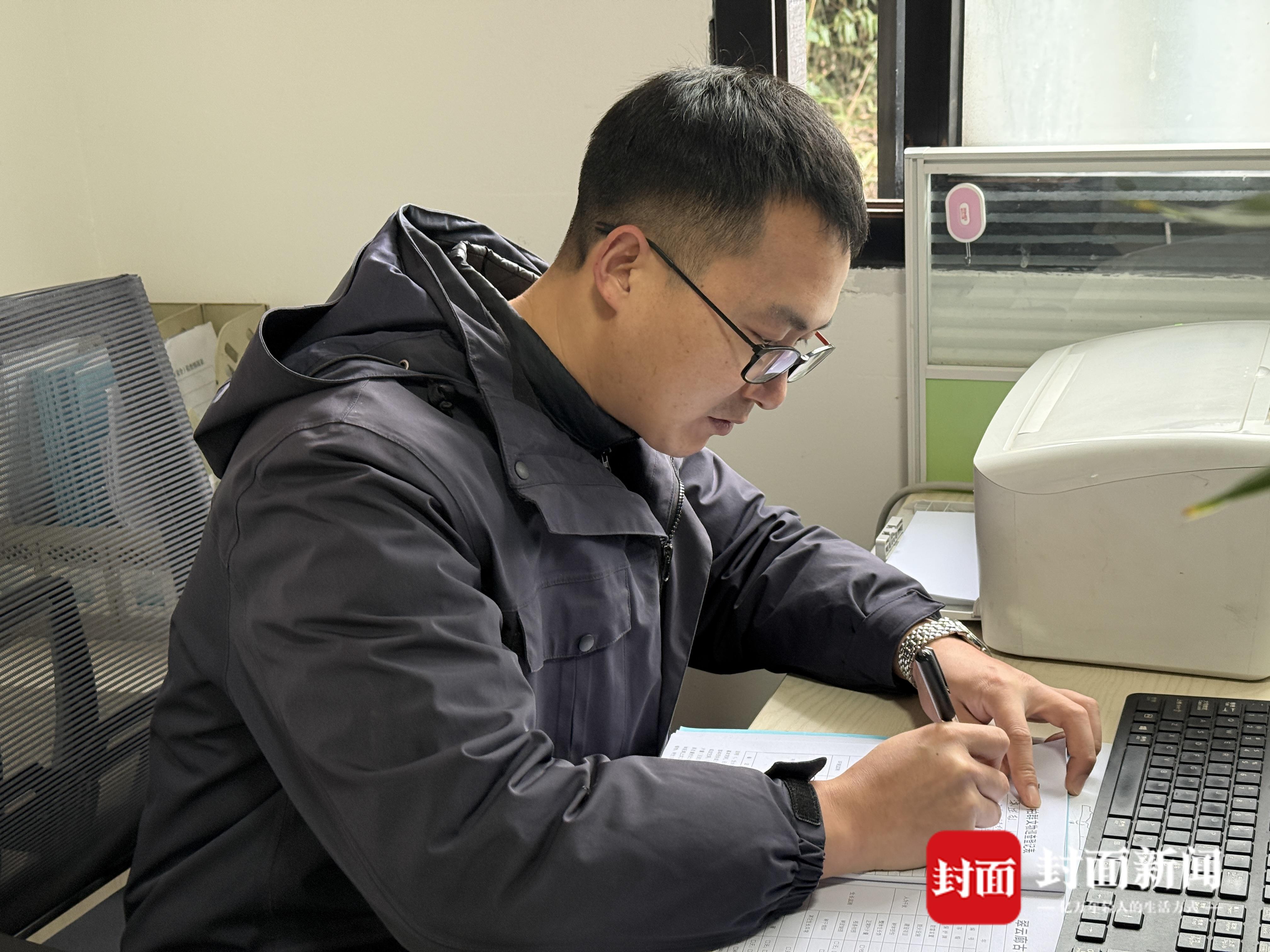 袁富海在办公室写台账纪录巡林数据